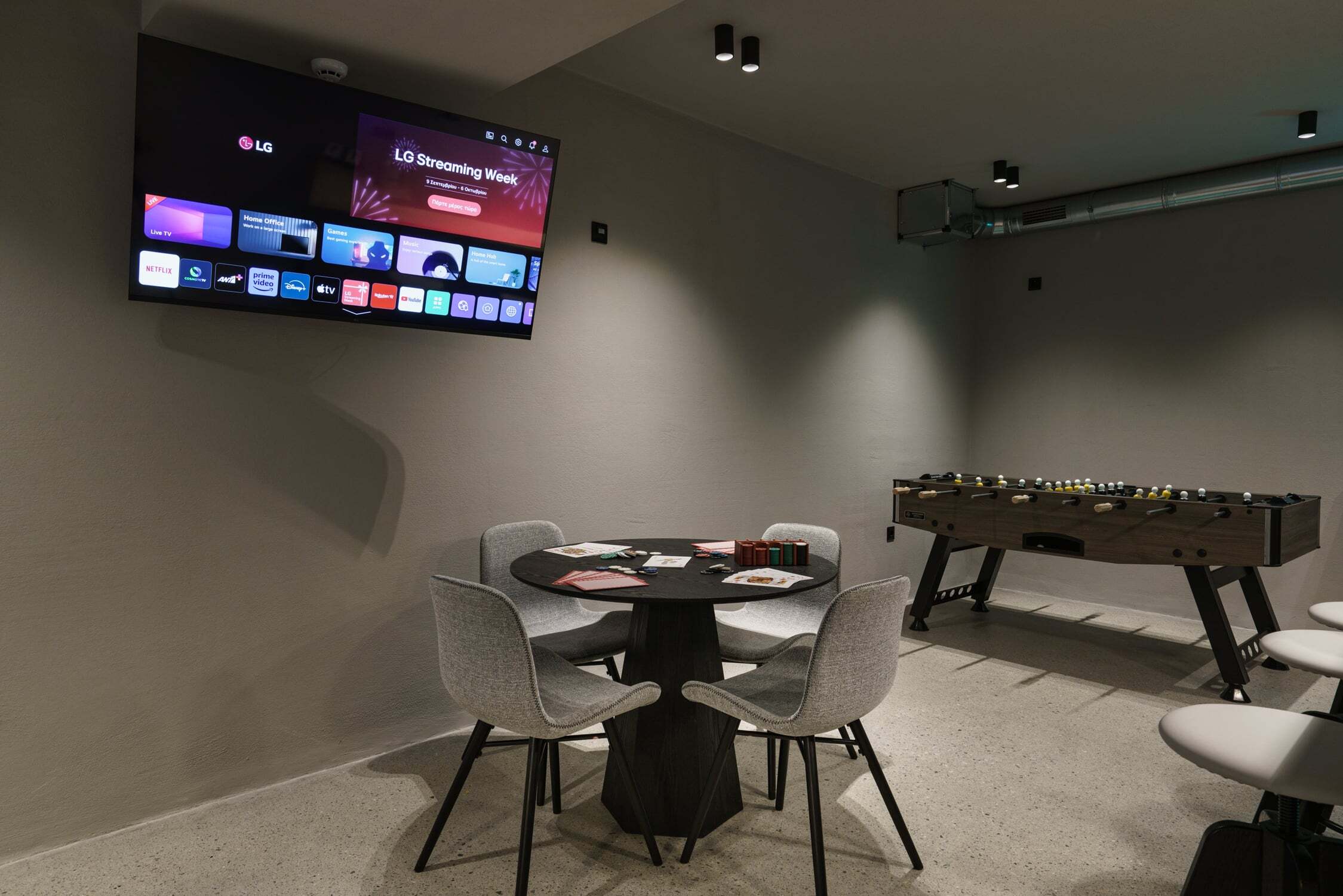 - Αίθουσα παιχνιδιού με μπιλιάρδο, τραπεζάκι, τραπέζι ποδοσφαίρου και μπαρ.